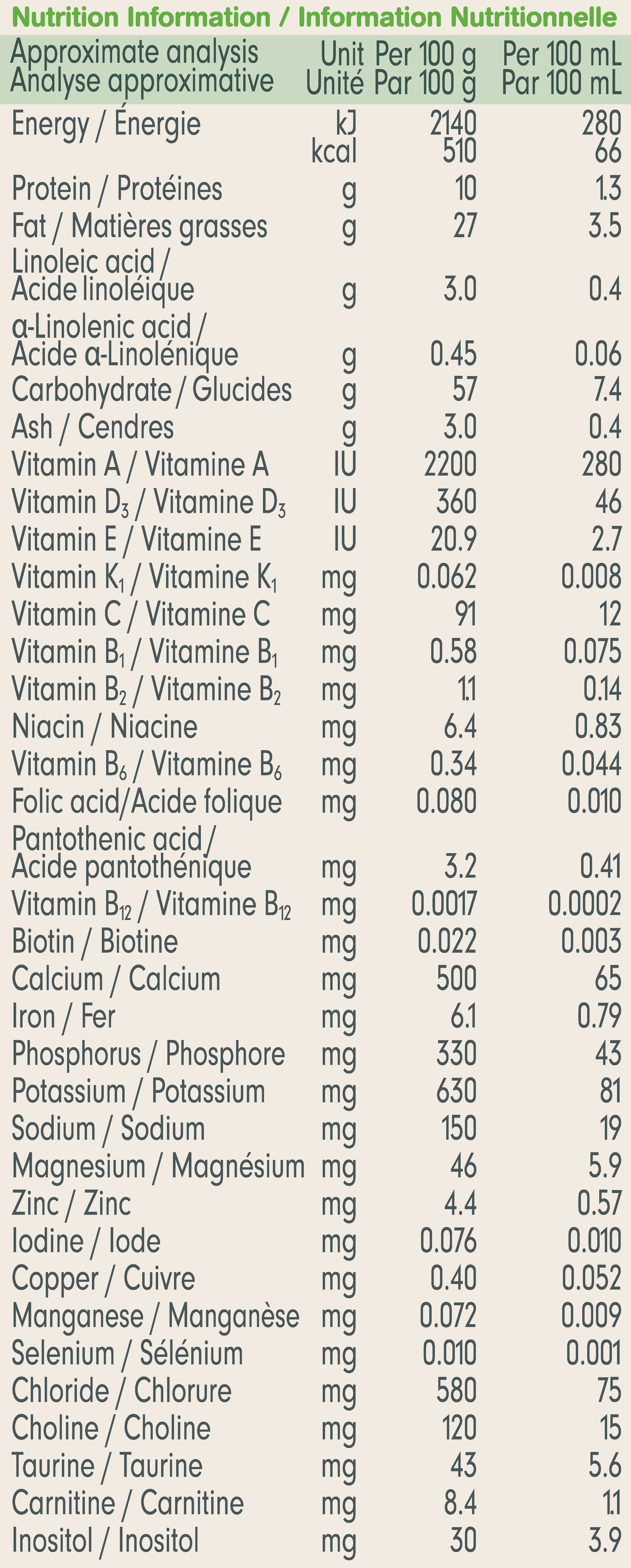 Goat whole milk, Lactose (from bovine milk), Vegetable oil blend (sunflower oils, canola oil, antioxidants (sunflower lecithin, mixed tocopherols)), Goat milk powders, Minerals (calcium citrate, sodium citrate, calcium hydroxide, ferrous sulphate, potassium chloride, zinc sulphate, copper sulphate, manganese sulphate, potassium iodide, sodium selenite), Vitamins (C, E, niacin, A, D3, calcium D-pantothenate, B12, K1, B1, B2, B6, folic acid, biotin), Choline chloride, L-tryptophan, L-isoleucine,Taurine, L-carnitine.