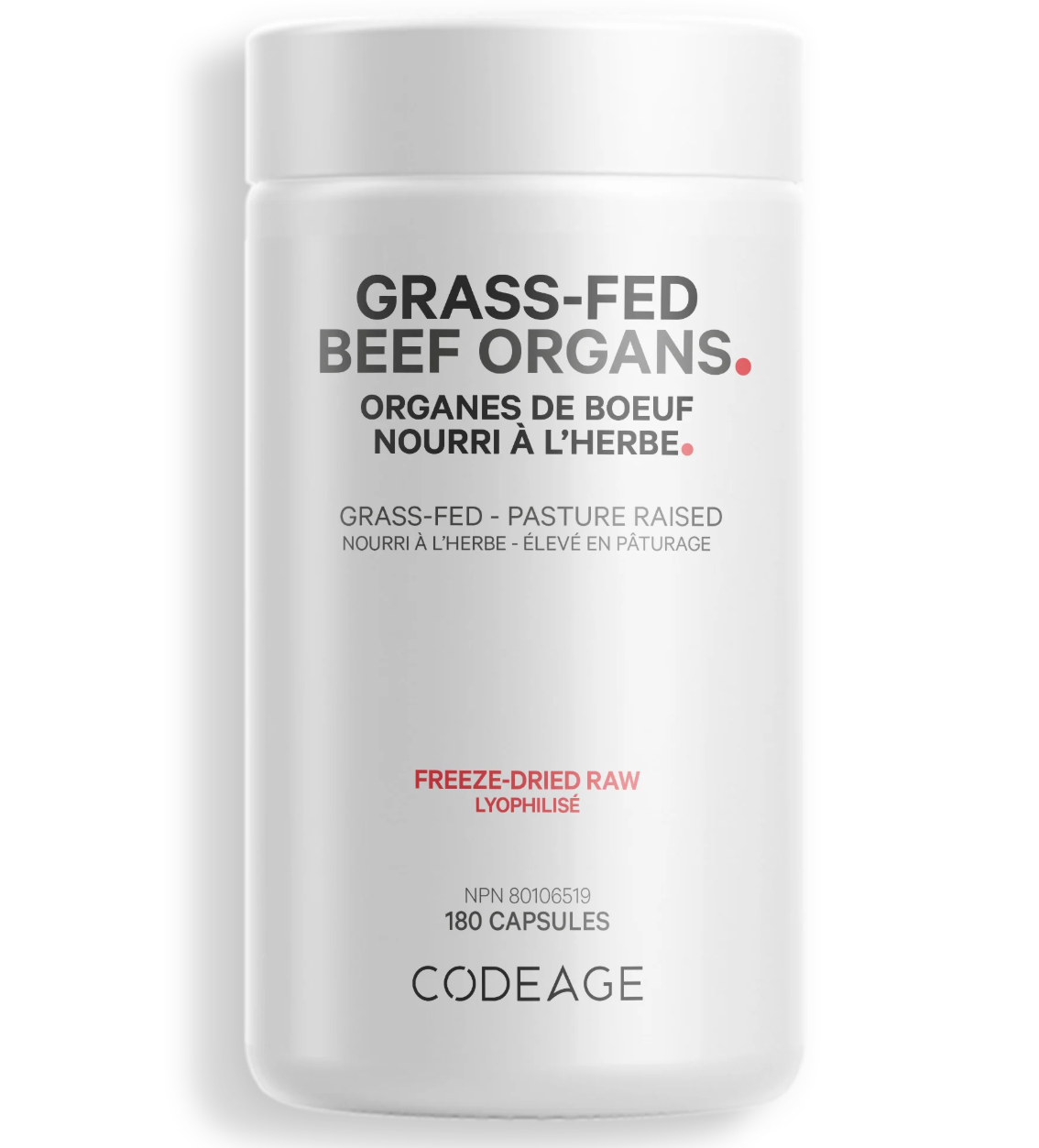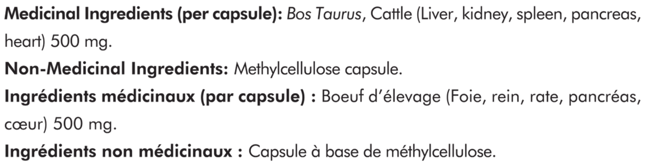 Medicinal Ingredients (per capsule): Bos Taurus, Cattle (Liver, kidney, spleen, pancreas, heart) 500 mg. Non-Medicinal Ingredients: Methylcellulose Capsule.