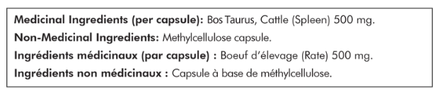 Grass-fed Bovine SpleenCAUTION: Keep out of the reach of children. Known Adverse Reactions: Discontinue use if allergic reaction occurs. Contra-Indications: Do not use if you are pregnant or breastfeeding. Precautions for Use: Store in a cool, dry place. Store in airtight container, protected from light, heat and moisture. Do not use if product has been opened or tampered with in any way.
