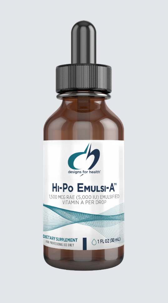 Hi-Po Emulsi-A™ is a high-potency formula that delivers concentrated vitamin A in a convenient liquid form. Just one drop of this unique product provides 5,000 IU of vitamin A, as retinol palmitate (1,500 mcg retinol activity equivalents [RAE]), allowing for flexibility in titration and ease of use. Vitamin A plays a critical role in immune function and is well known for promoting eye health, thyroid function, and red blood cell function.*