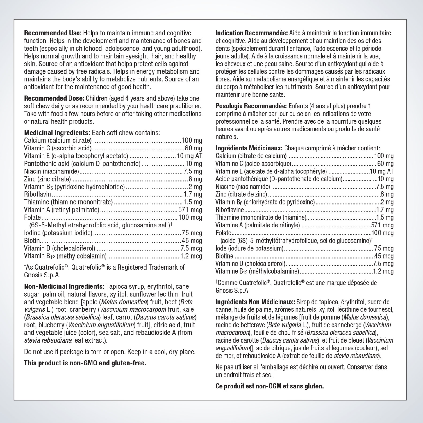 Non-Medicinal Ingredients: Tapioca syrup, erythritol, cane sugar, palm oil, natural flavors, xylitol, sunflower lecithin, fruit and vegetable blend [apple (Malus domestica) fruit, beet (Beta vulgaris L.) root, cranberry (Vaccinium macrocarpon) fruit, kale (Brassica oleracea sabellica) leaf, carrot (Daucus carota sativus) root, blueberry (Vaccinium angustifolium) fruit], citric acid, fruit and vegetable juice (color), sea salt, and rebaudioside A (from stevia rebaudiana leaf extract).