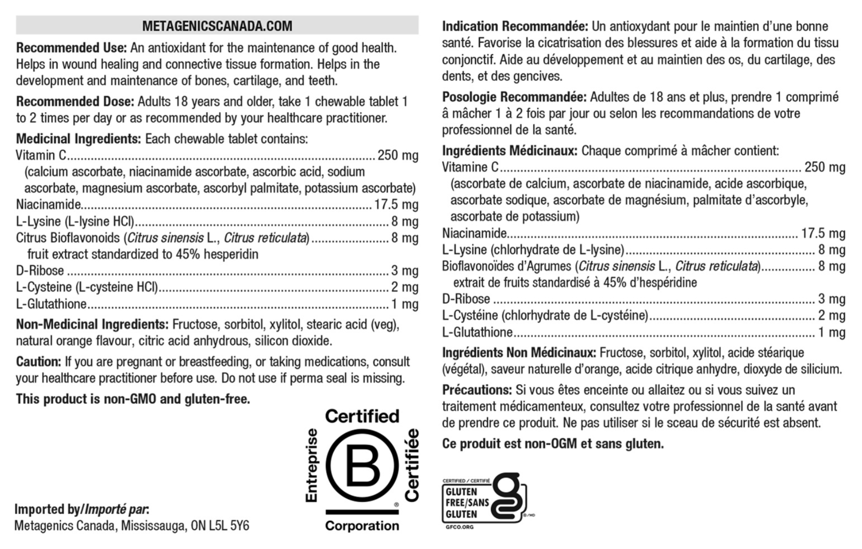 Non-Medicinal Ingredients: Fructose, sorbitol, xylitol, stearic acid (veg), natural orange flavour, citric acid anhydrous, silicon dioxide, and tetrasodium pyrophosphate.