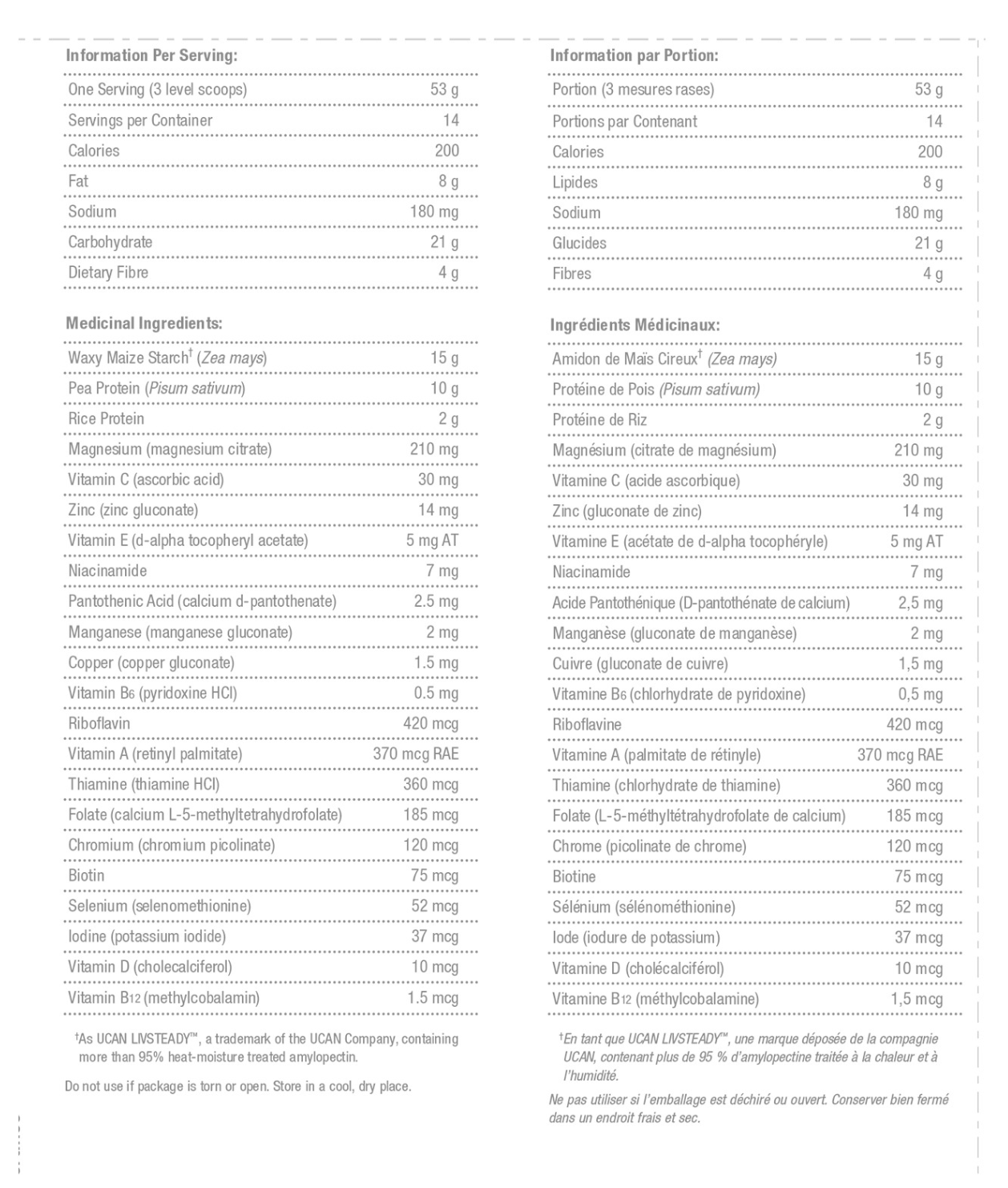 Non-Medicinal Ingredients: Olive oil, natural flavours, oat hull fiber, silicon dioxide, L-leucine, Chinese cinnamon, guar gum, L-isoleucine, L-valine, xanthan gum, monk fruit extract, and rosemary extract.