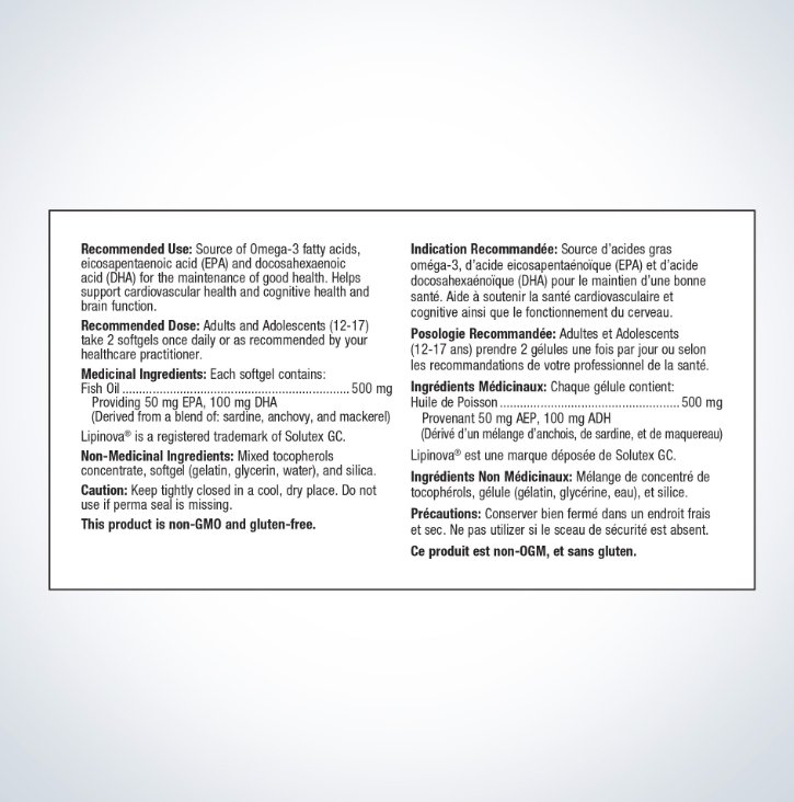 Recommended Use:Source of Omega-3 fatty acids, eicosapentaenoic acid (EPA) and docosahexaenoic acid (DHA) for the maintenance of good health. Helps support cardiovascular health and cognitive health and brain function