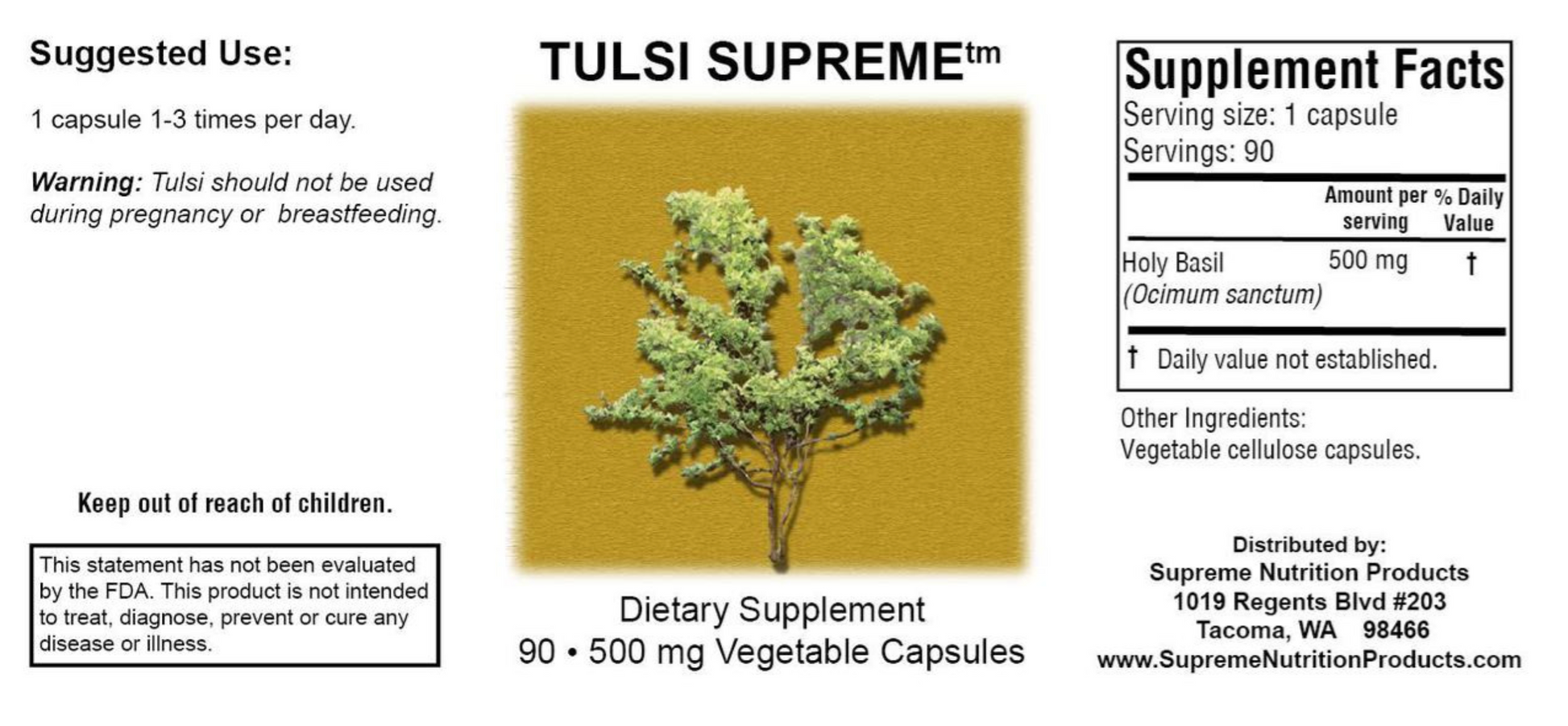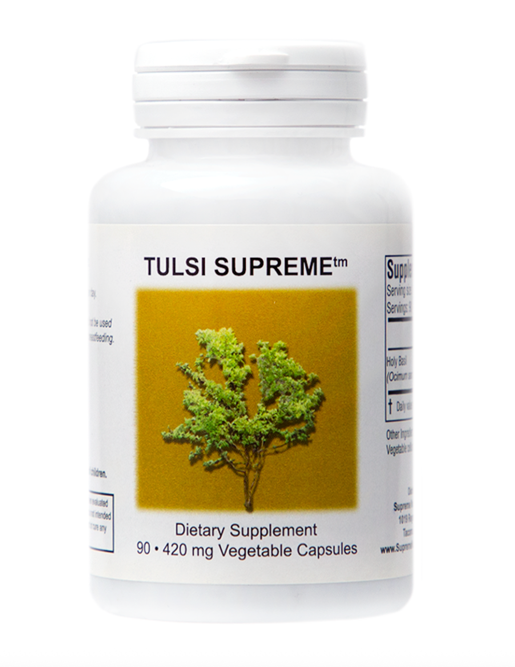 Tulsi Supreme™ is packaged in a bottle containing 90 veggie capsules, each containing approximately 500 mg of Ocimum sanctum without fillers, binders or excipients. 1-4 capsules per day --- Because of its strong adrenal restorative properties, depending on genetics, some people only need a very small dose, 1 cap daily, while others may need up to 4 daily (one cap 4x/day). You may want to start low and increase as needed.