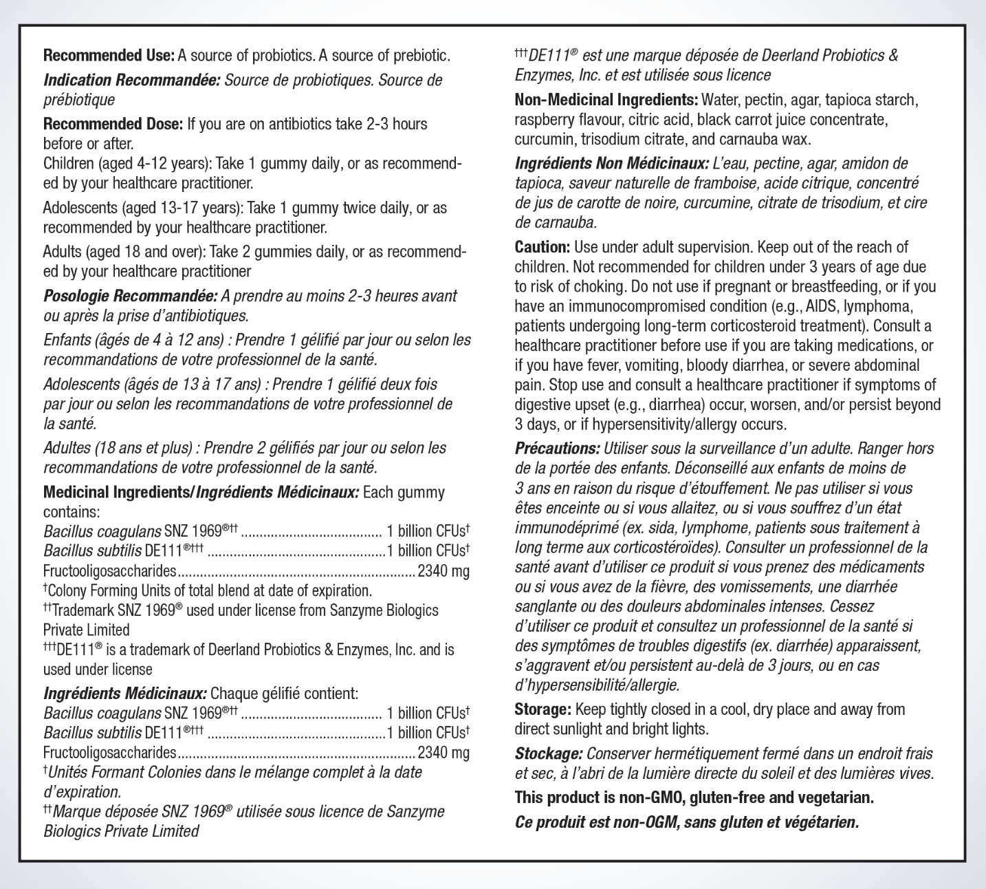 Non-Medicinal Ingredients:Water, pectin, agar, tapioca starch, raspberry flavour, citric acid, black carrot juice concentrate, curcumin, trisodium citrate, and carnauba wax.
